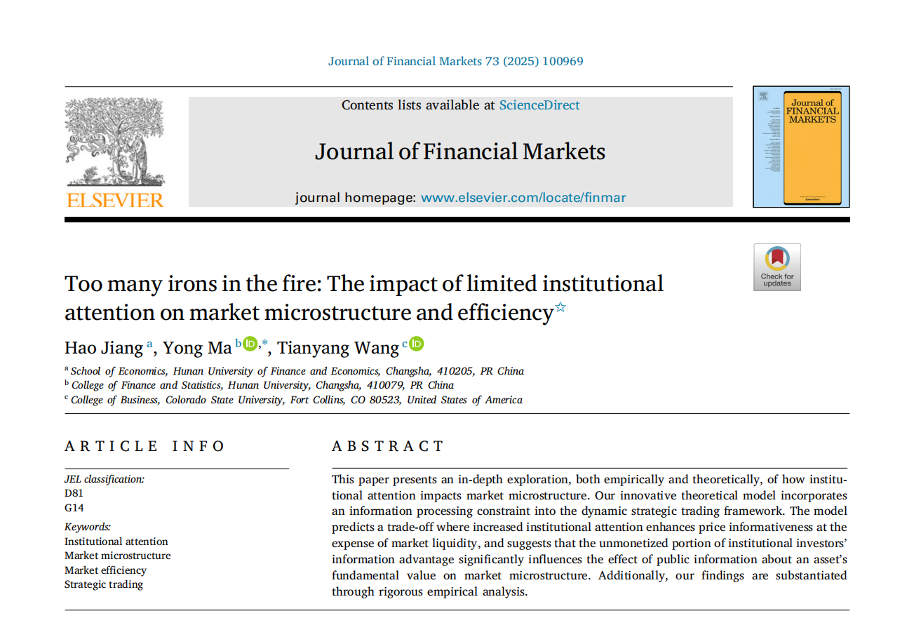 近日,线上真人百家乐 马勇教授与湖南财政经济线上真人百家乐 江灏博士(线上真人百家乐 2023届博士毕业生)、科罗拉多州立大学王天阳教授合作的学术论文“Too many irons in the fire: the impact of limited institutional attention on market microstructure and efficiency”在金融学国际权威期刊Journal of Financial Markets,Volume 73, March 2025发表。