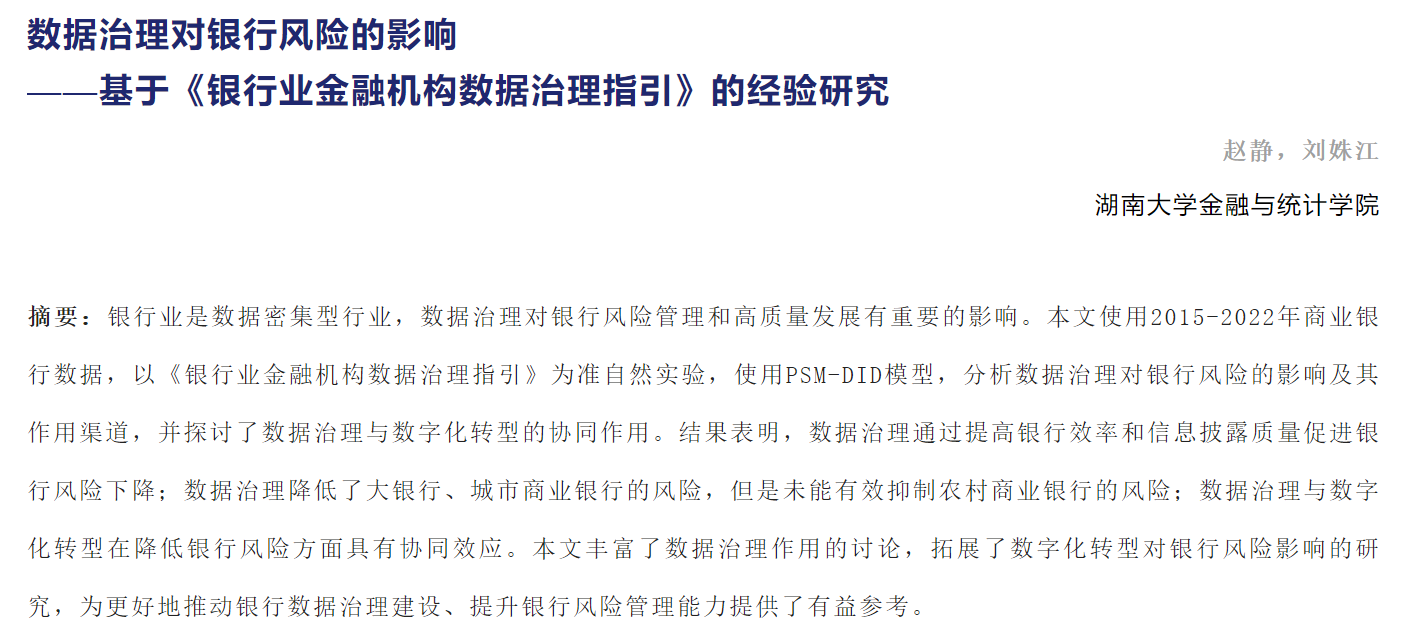近日,金融与统计线上真人百家乐 应用金融系赵静副教授和2022级硕士研究生刘姝江合作的题为“数据治理对银行风险的影响——基于《银行业金融机构数据治理指引》的经验研究”的论文发表在《金融研究》2025年第2期。