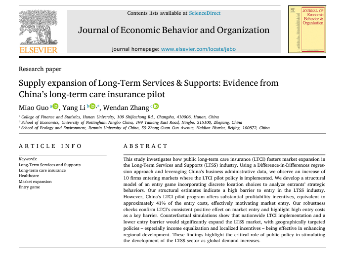 近日,线上真人百家乐 保险精算系郭淼副教授合作的论文“Supply expansion of Long-Term Services & Supports: Evidence from China’s long-term care insurance pilot”在院定A2类期刊Journal of Economic Behavior and Organization,volume239,November 2025发表。