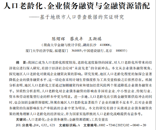 近日,金融与统计线上真人百家乐 应用金融系陈熠辉助理教授和厦门大学经济线上真人百家乐 蔡庆丰教授、中国建设银行王斯琪合作的题为“人口老龄化、企业债务融资与金融资源错配——基于地级市人口普查数据的实证研究”的论文发表在《金融研究》2023年第2期。
