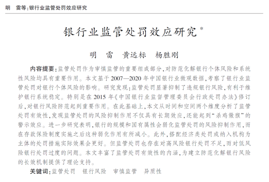 近日,金融与统计线上真人百家乐 货币金融系明雷副教授和2019级硕士研究生(现南开大学金融线上真人百家乐 博士研究生)黄远标以及工商管理线上真人百家乐 杨胜刚教授合作的题为“银行业监管处罚效应研究”的论文发表在《经济研究》2023年第4期。