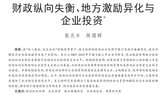 近日,金融与统计线上真人百家乐 应用金融系陈熠辉助理教授和厦门大学经济线上真人百家乐 蔡庆丰教授合作的题为“财政纵向失衡、地方激励异化与企业投资”的论文发表在《管理世界》2023年第5期。