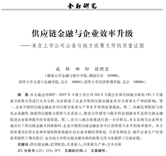 近日,金融与统计线上真人百家乐 应用金融系成程副教授和清华大学五道口金融线上真人百家乐 田轩教授,清华大学经济与管理线上真人百家乐 徐照宜博士后合作的题为“供应链金融与企业效率升级——来自上市公司公告与地方政策文件的双重证据”的论文发表在《金融研究》2023年第6期。