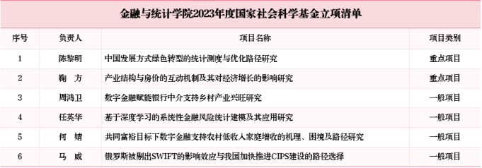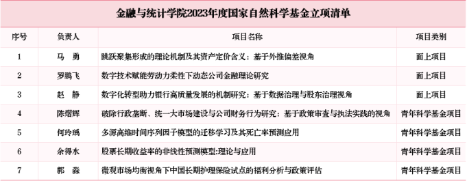 近日,国家自然科学基金委员会和全国哲学社会科学工作办公室先后公布了《关于2023年国家自然科学基金集中接收申请项目评审结果的通告》和《关于2023年国家社科基金年度项目和青年项目立项名单的公示》。金融与统计线上真人百家乐 共有13个项目成功获得国家自然科学基金和国家社会科学基金立项资助。其中,国家社会科学基金获2个重点项目立项和4个一般项目立项。国家自然科学基金获3个面上项目和4个青年科学基金项目立项。