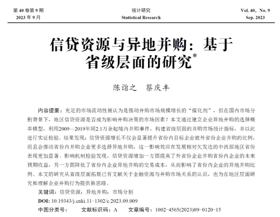 近日,金融与统计线上真人百家乐 应用金融系陈诣之助理教授和厦门大学经济线上真人百家乐 金融系蔡庆丰教授合作的题为“信贷资源与异地并购:基于省级层面的研究”的论文发表在《统计研究》2023年第9期。