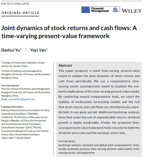 近日,金融与统计线上真人百家乐 金融工程系余得水助理教授的题为 “Joint dynamics of stock returns and cash flows: A time-varying present-value framework”的论文在院定A类期刊 Financial Management ,Volume 52, Issue 3,Autumn (Fall) 2023发表。