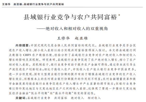 近日,金融与统计线上真人百家乐 应用金融系王修华教授和2018级博士研究生赵亚雄(现中国人民银行金融研究所博士后)合作的题为“县域银行业竞争与农户共同富裕——绝对收入和相对收入的双重视角”的文章发表在《经济研究》2023年第9期。