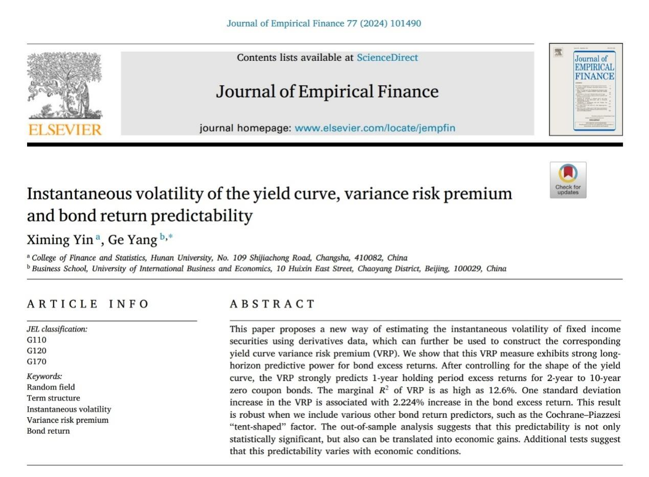 近日,金融与统计线上真人百家乐 金融工程系助理教授尹希明作为第一作者撰写的论文 “ Instantaneous volatility of the yield curve, variance risk premium and bond return predictability ” 在院定 A 类期刊 Journal of Empirical Finance,Volume 77, June 2024 发表。