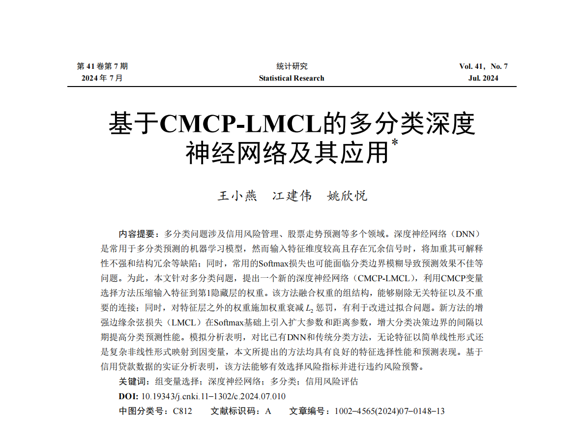 近日,金融与统计线上真人百家乐 统计系王小燕副教授题为“基于CMCP-LMCL的多分类深度神经网络及其应用”的论文在院定A类期刊《统计研究》2024年第7期发表。
