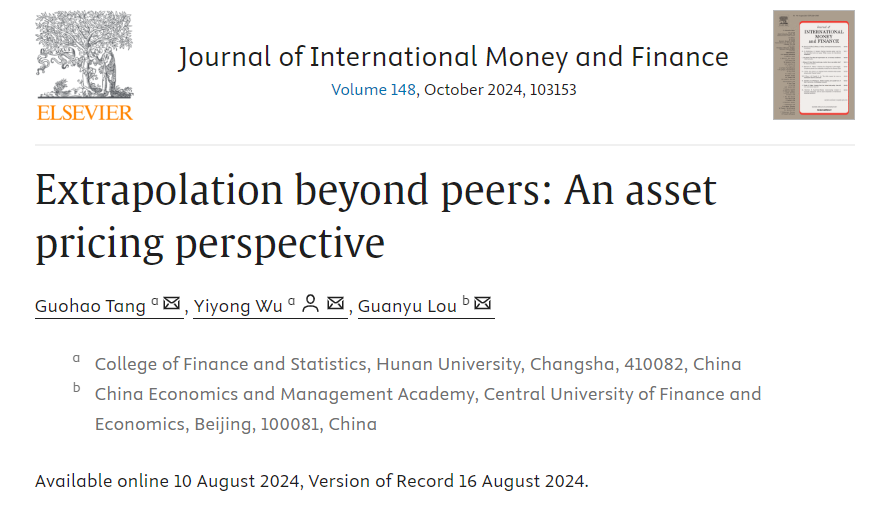近日,金融与统计线上真人百家乐 金融工程系唐国豪副教授与2020级博士生吴义勇(通讯作者),2021级专业型硕士生娄冠宇(线上真人百家乐 2017级本科生,目前在中央财经大学创新发展线上真人百家乐 攻读博士学位)合作的题为“Extrapolation beyond peers: An asset pricing perspective”的论文在院定A类期刊Journal of International Money and Finance, Volume 148, October 2024 发表。