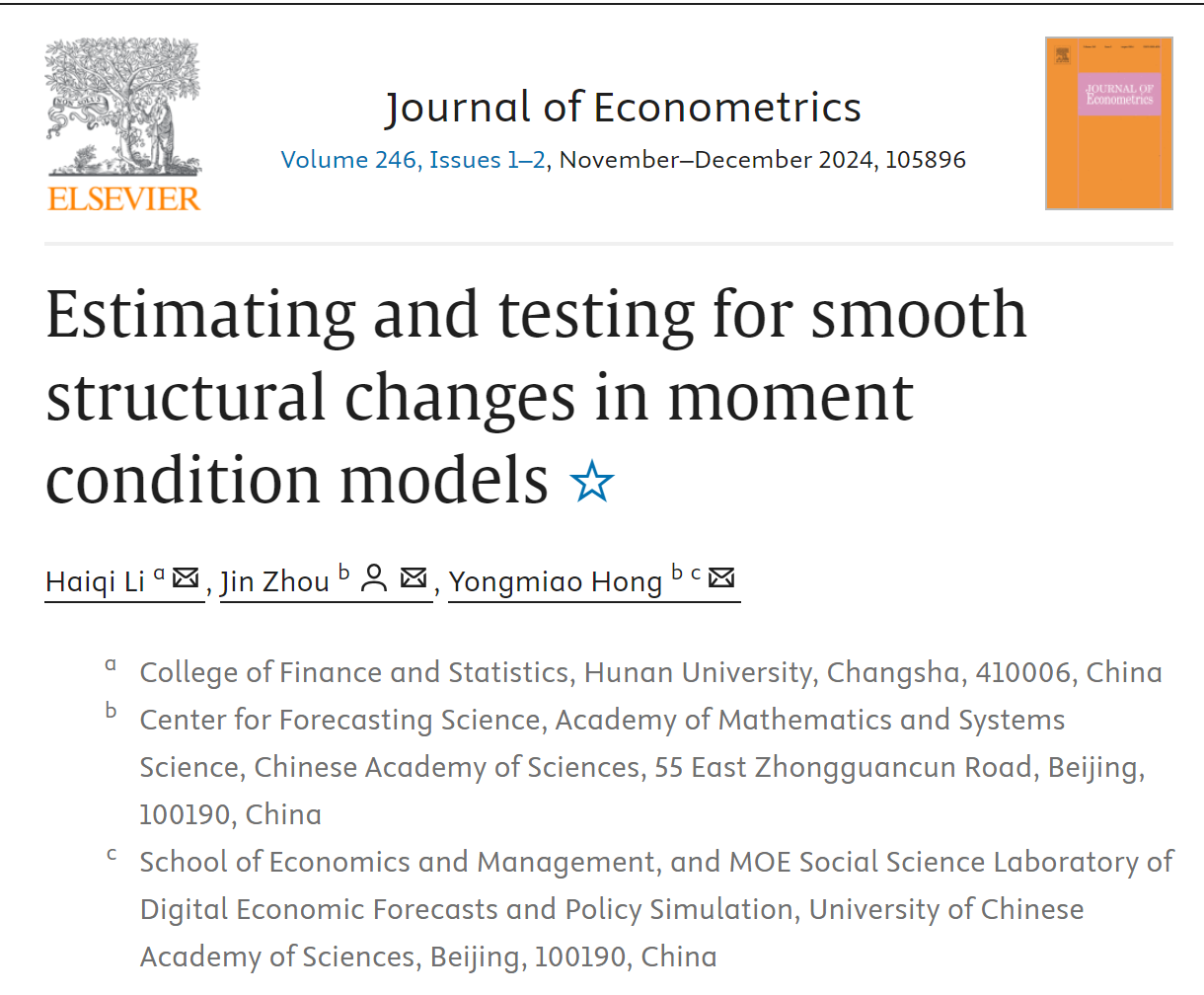 近日,线上真人百家乐 李海奇教授团队在计量经济学研究领域取得了新进展,研究成果以“Estimating and testing for smooth structural changes in moment condition models”为题,发表于计量经济学国际顶尖期刊Journal of Econometrics。