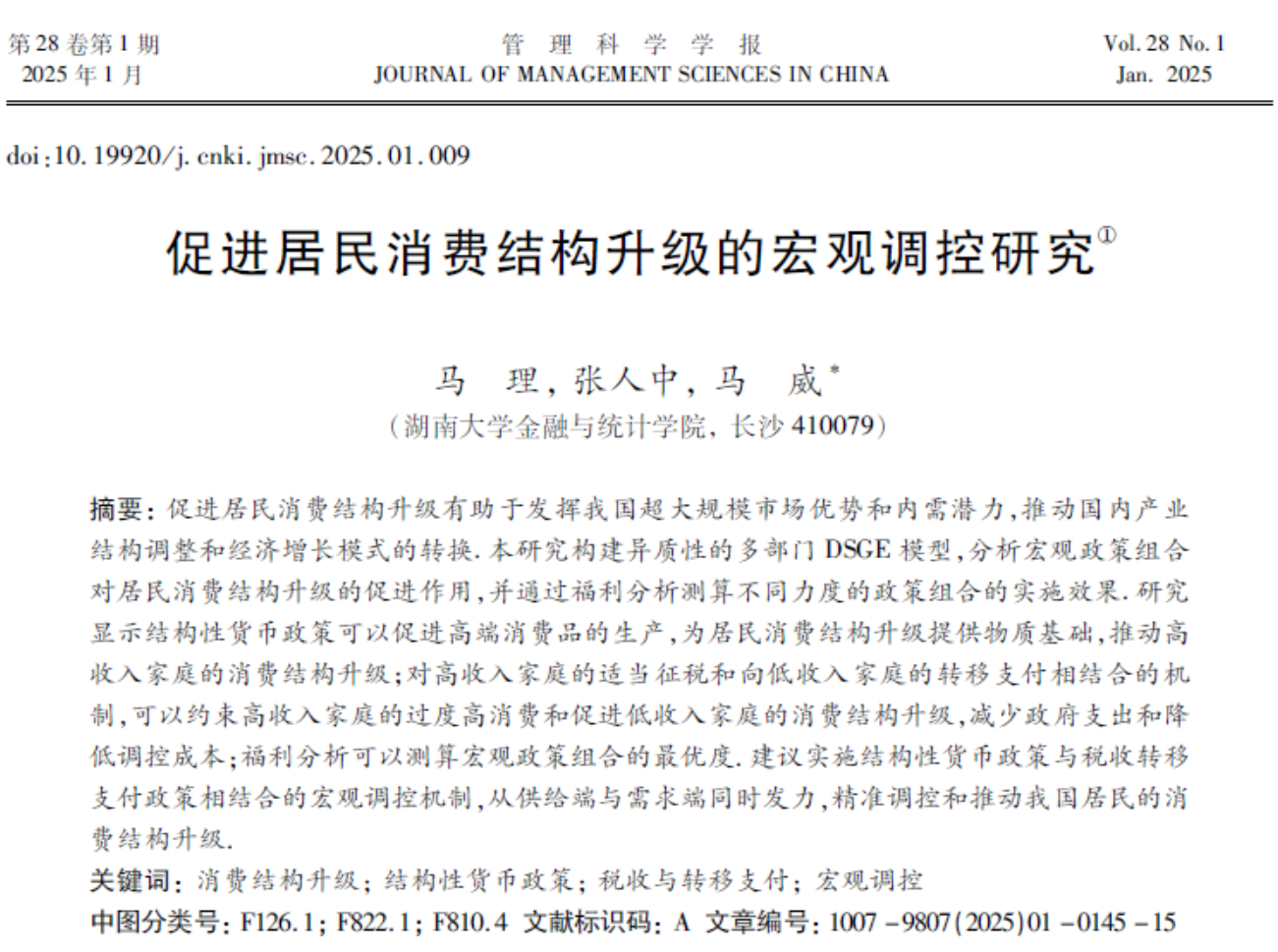 近日,线上真人百家乐 金融与统计线上真人百家乐 马理教授与2021级博士研究生张人中、马威教授合作的题为“促进居民消费结构升级的宏观调控研究”的论文发表在《管理科学学报》2025年第1期。