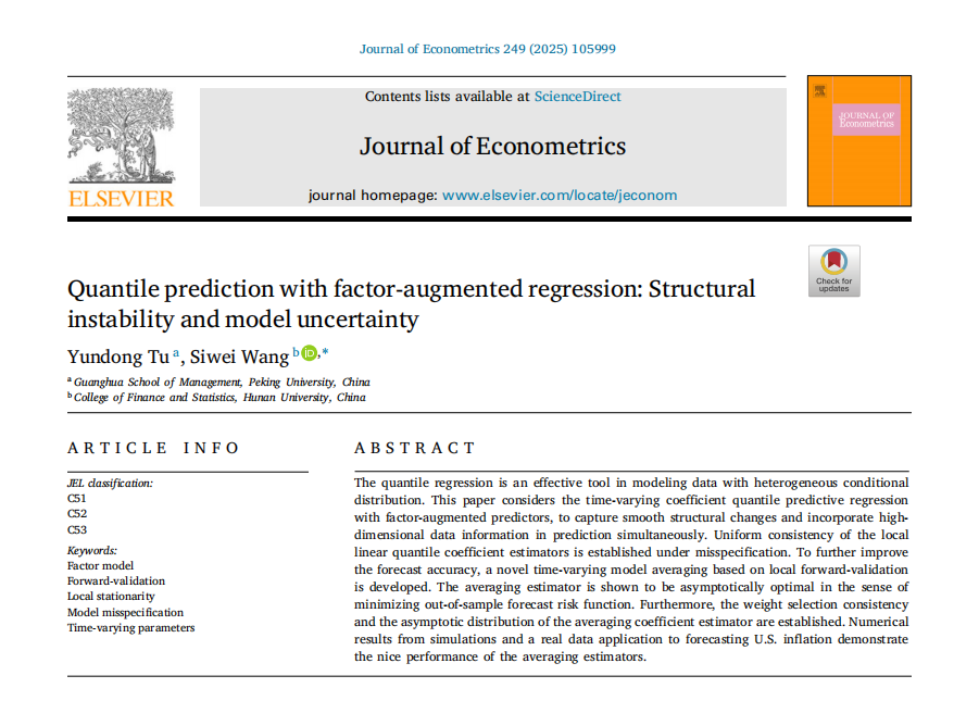 近日,线上真人百家乐 汪思韦助理教授与北京大学涂云东教授合作完成的学术论文“Quantile prediction with factor-augmented regression: Structural instability and model uncertainty”在计量经济学国际顶尖期刊Journal of Econometrics在线发表。