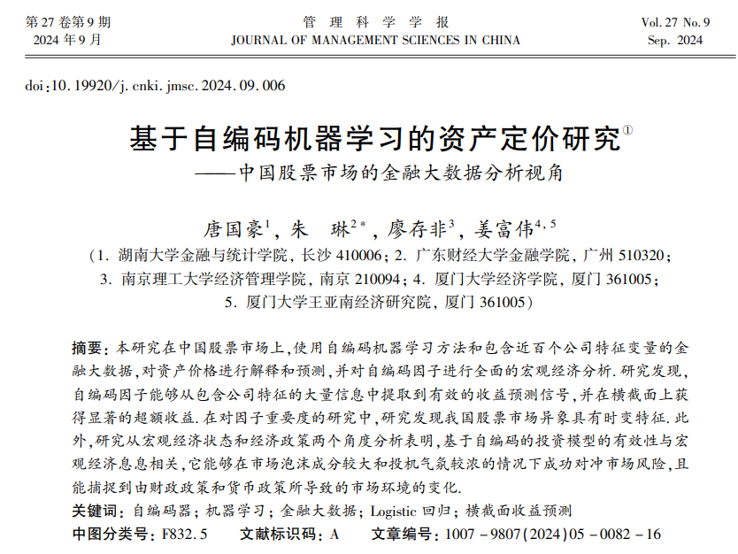 近日,金融与统计线上真人百家乐 金融工程系唐国豪副教授与线上真人百家乐 2024届博士毕业生朱琳、2022届博士毕业生廖存非,厦门大学经济线上真人百家乐 、王亚南经济研究院姜富伟教授的题为“基于自编码机器学习的资产定价研究——中国股票市场的金融大数据分析视角”的论文发表在《管理科学学报》2024年第9期。
