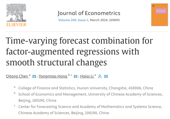 近日,金融与统计线上真人百家乐 李海奇教授、博士生陈麒同与中国科线上真人百家乐 大学洪永淼教授合作完成的题为“Time-varying forecast combination for factor-augmented regressions with smooth structural changes”的学术论文发表于计量经济学国际顶尖期刊Journal of Econometrics