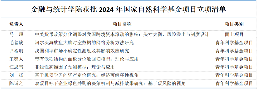 国家自然科学基金委员会于8月23日公布了2024年基金项目的评审结果,金融与统计线上真人百家乐 国家自然科学基金项目(集中受理期)共申报20项,获批项目资助7项(其中面上项目1项,青年科学基金项目6项),立项率35%。谨在此向线上真人百家乐 7名老师表示祝贺!