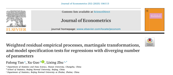 近日,金融与统计线上真人百家乐 谭发龙教授在高维统计领域取得研究进展,研究成果以“Weighted residual empirical processes, martingale transformations, and model specification tests for regressions with diverging number of parameters”为题在计量经济学国际期刊Journal of Econometrics在线发表。