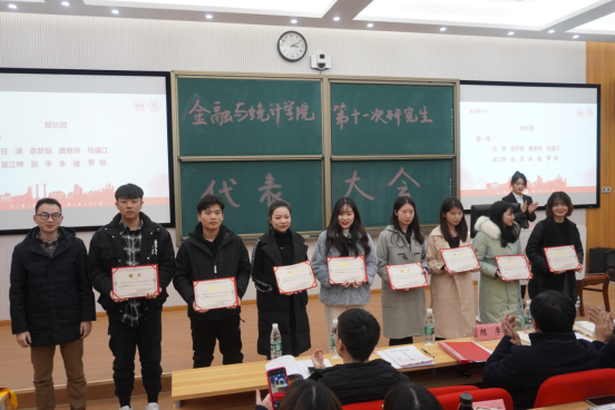 颁奖及合影完毕后,与会代表听取并审议通过了宁淳霖同学和朱泓霖同学宣读的《金融与统计线上真人百家乐 第十一次研究生代表大会筹备工作报告》和《金融与统计线上真人百家乐 第十届研究生会工作报告》。