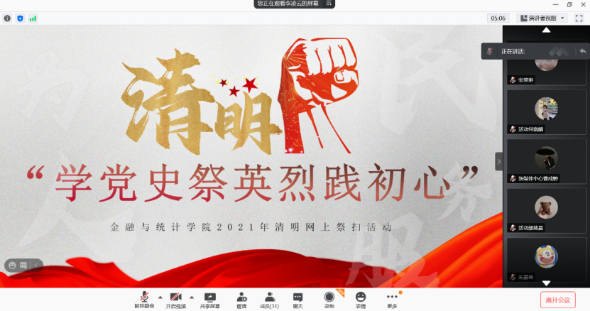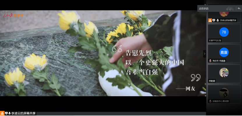 研究生党员代表周芷薇同学在线上留言,“清明时节,我们向以血肉之躯捍卫祖国尊严,用宝贵生命换来我们安宁的英烈,致敬!我们党的每一段革命历史,都是一部理想信念的生动教材。我们一定要继承革命先辈的遗志,发扬他们的精神,在他们用生命和鲜血开辟的道路上不懈奋斗、永远奋斗。”