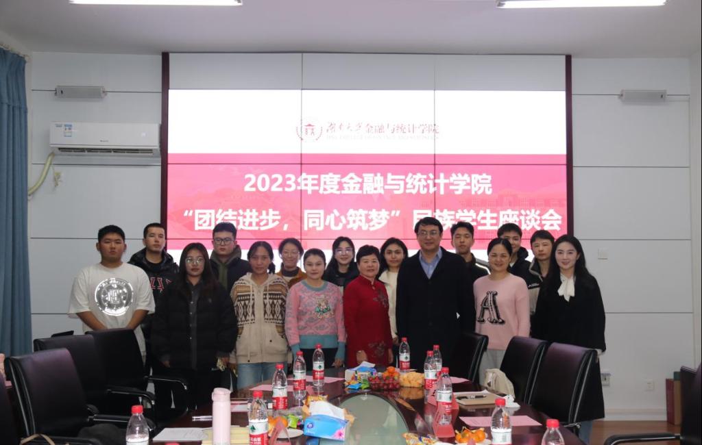 12月12日,金融与统计线上真人百家乐 举行以“团结进步,同心筑梦”为主题的民族学生座谈会,湖南省民族团结教育名师工作室——田慧工作室首席专家田慧,院党委副书记颜李,少数民族专职辅导员布阿提开姆,学工办主任谢君、各年级民族学生代表参会,辅导员王雪雯主持。