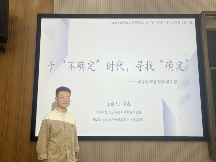 牟森老师围绕“为什么是精算”“如何走这条路”“未来在哪里”三个维度展开深度解读。他指出,精算不仅是数理技能与商业思维的深度融合,更是在不确定性中寻找确定性解决方案的关键能力。“专业不是为了比谁更聪明,而是让自己在复杂的世界里有抓手”,他的分享让在场学子对精算职业的核心价值有了更清晰的认知。
