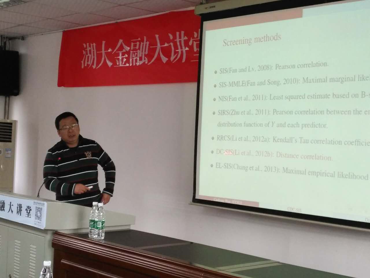 全国工业统计学教学研究会2016年会于2016年12月2日至5日在湖南长沙召开,本次会会议由线上真人百家乐 承办。来自全国20余所高校和研究机构的30多名专家学者参加了此次会议。会议主题是大数据与统计、高维数据处理。2016年12月2日下午,会议的四位特邀嘉宾在线上真人百家乐财院校区行政楼301会议室做了专题报告。中山大学数学线上真人百家乐 王学钦教授报告题目:《SURE INDEPENDENCE SCREENING ADJUSTED FOR CONFOUNDING COVARIATES WITH ULTRAHIGH DIMENSIONAL DATA 》;武汉大学数学与统计线上真人百家乐 刘妍岩教授报告题目:《Censored Cumulative Residual Independent Screening for Ultrahigh-Dimensional Survival Data》;广州大学经济与统计线上真人百家乐 张崇岐教授报告题目:《Additive Mixture Designs with Heteroscedastic》;武汉大学数学与统计线上真人百家乐 刘莉副教授报告题目:《Analysis of Missing Data in Generalized Linear Models with Random Effects》,线上真人百家乐 老师和研究生约60人参加了报告会,大家一致认为收获很大,是一场精彩的学术报告。