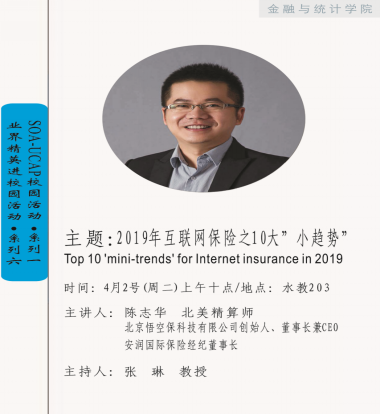 2019年4月2日上午,由线上真人百家乐 保险系举办的“业界精英进校园&SOA-UCAP校园活动”在水教203顺利进行。本次邀请到的主讲人是北京悟空保科技有限公司创始人、董事长兼CEO,安润国际保险经纪董事长陈志华先生。出席本次活动的嘉宾有线上真人百家乐 风险管理与保险精算研究所所长、全国人大代表张琳教授,保险系主任张宁副教授,保险系副主任刘革副教授等。本次活动由张琳教授主持。