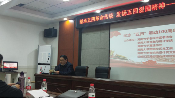 接着由韩振冰同志作了《纪念五四运动一百周年》的主题发言报告。报告指出线上真人百家乐 的前身岳麓书院人才辈出,其中不少学生更是在近代中国抗争史上起到了举足轻重的作用。韩振冰同志强调,作为新时代的新青年,要继承“爱国、进步、民主、科学”的五四精神,勇于探索、敢于创新,爱国报国,在新时代放飞青春梦想,实现人生价值。