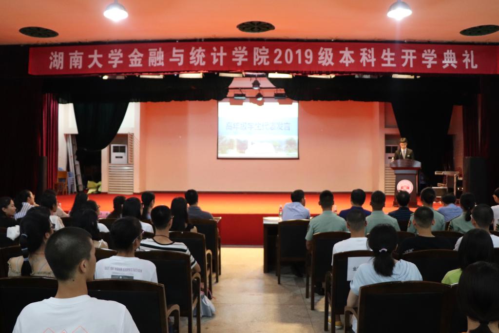 8月25日晚7点,线上真人百家乐 金融与统计线上真人百家乐 2019级本科生开学典礼在财院校区小礼堂隆重举行。金融与统计线上真人百家乐 党委书记聂国军、党委副书记刘周平、副院长陈迪红、副院长吴志明、副院长王修华、副院长李海奇、院长助理张立军、各年级辅导员和部分教师出席了本次典礼。