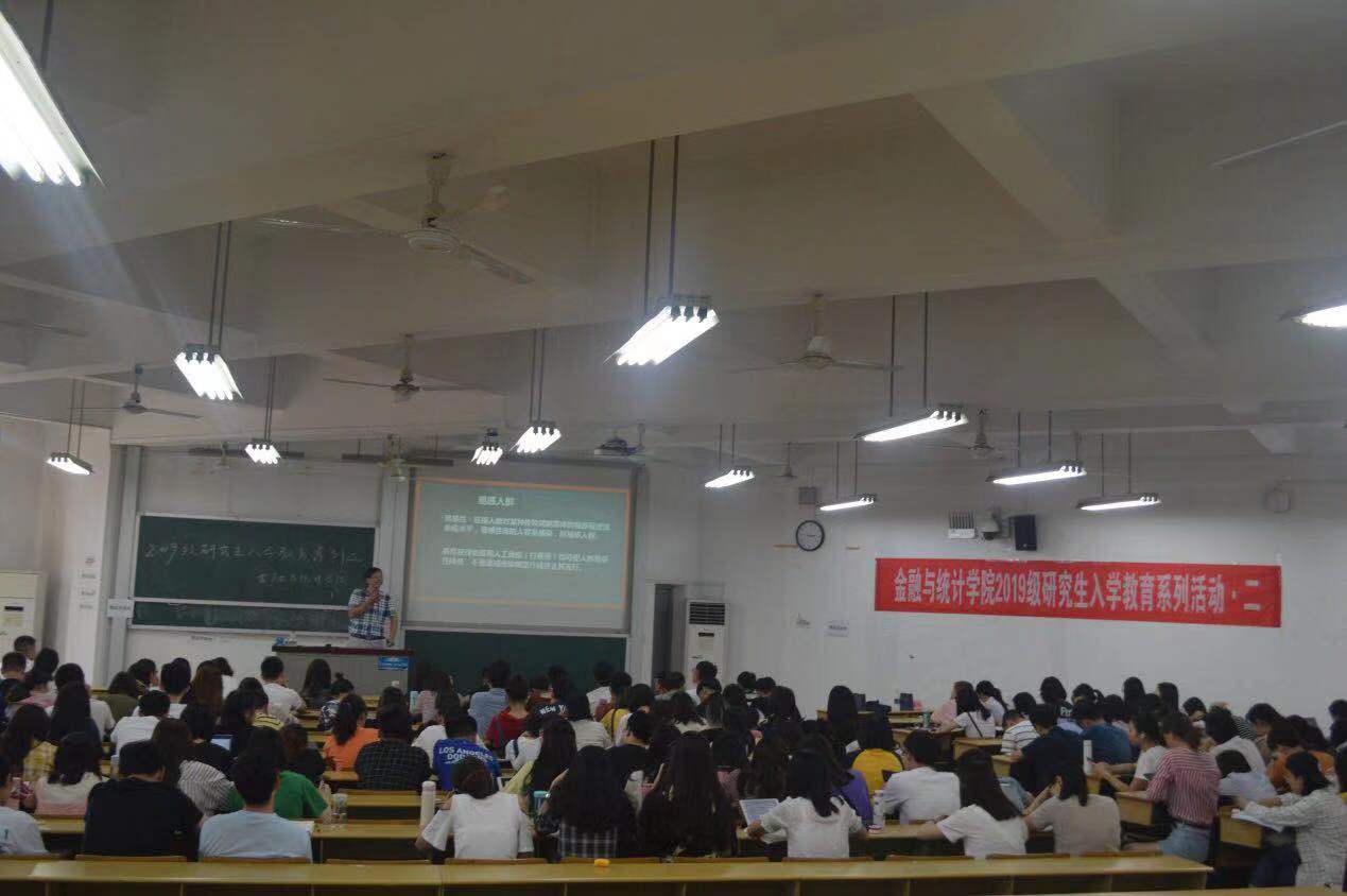 9月20日下午,金融与统计线上真人百家乐 2019级研究生入学教育系列活动第二场在财院校区二教502举行。为贯彻落实省教育厅关于做好校园传染病防控工作的通知精神,提升线上真人百家乐 大学生整体健康素养,建立传染病重在预防的健康意识以及让新同学尽快了解和使用图书馆的线上、线下资源,养成自主学习的习惯,线上真人百家乐 邀请了线上真人百家乐 财院校区负责人、二级营养师、医学副教授、湖南省健康管理学会培训中心教师沈新强老师、线上真人百家乐 科学利用图书馆、学科服务中心副研究馆员刘美桃老师分别进行主题讲座。2019级全体研究生到场学习。