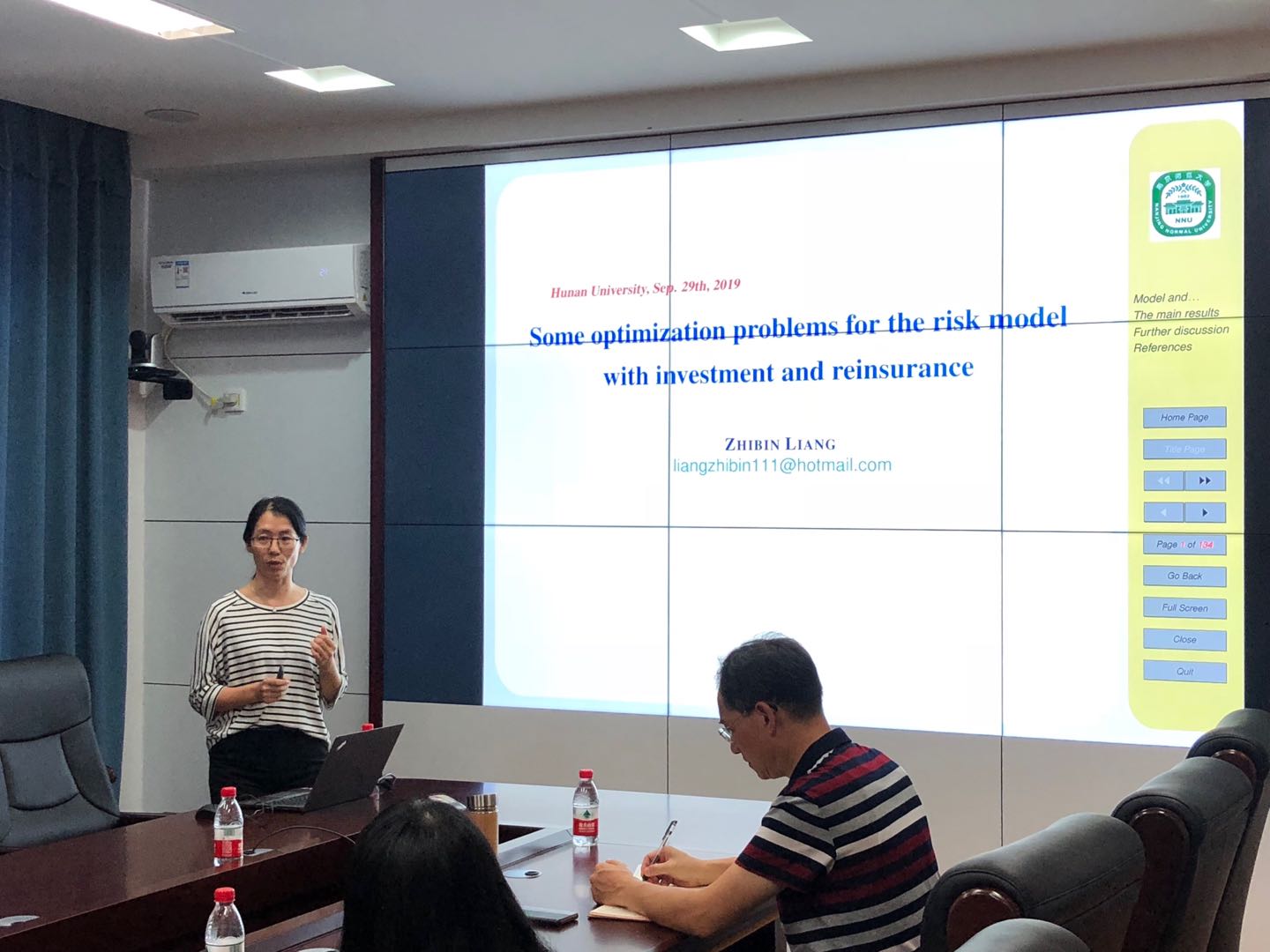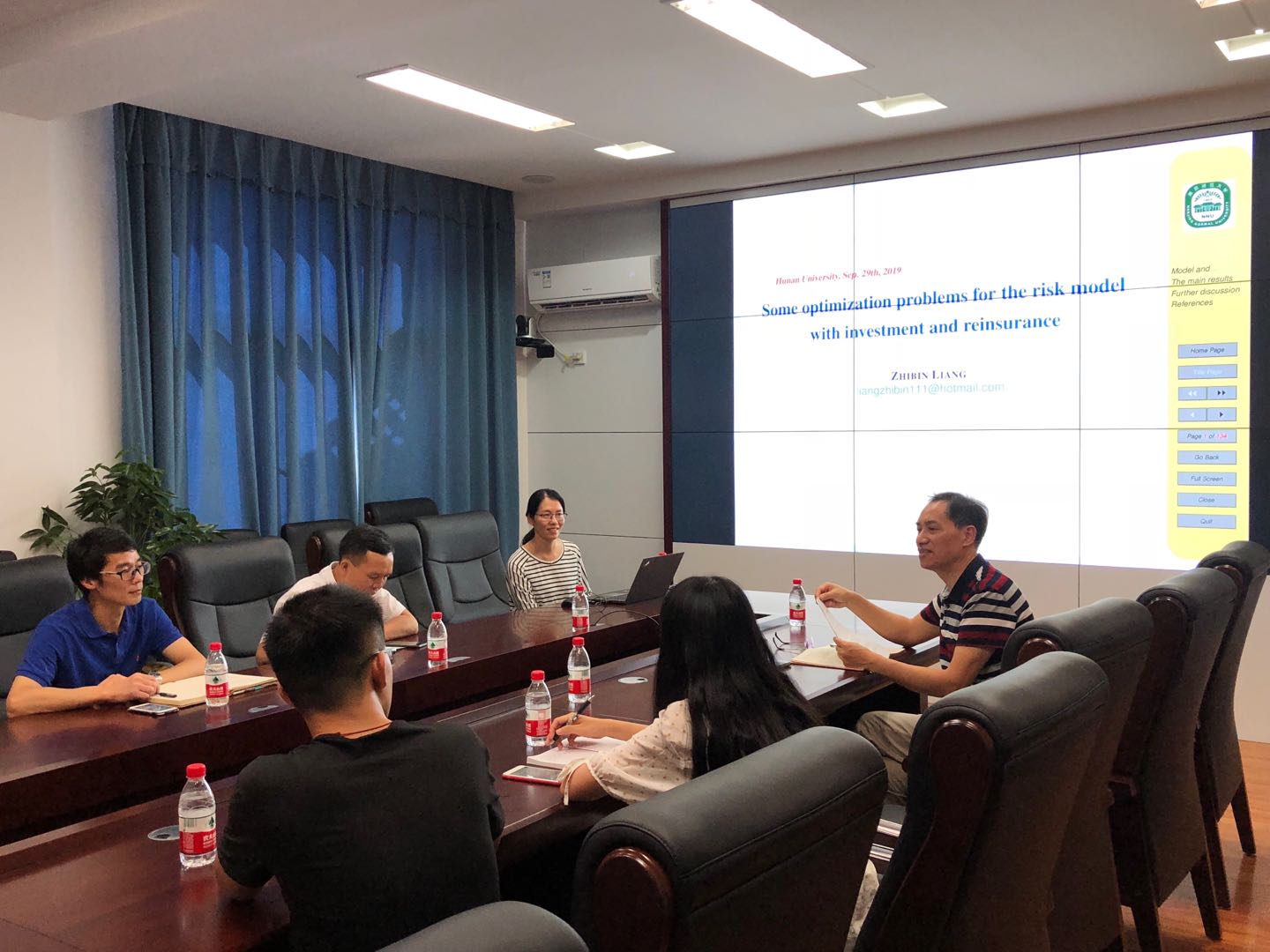 9月29日下午,第234期金融与统计论坛在红楼226会议室举行,本次论坛的主题是:Some optimization problems for the risk models with investment and reinsurance,主讲人是南京师范大学的梁志彬教授。此次论坛由金融与统计线上真人百家乐 副院长陈迪红教授主持,金融与统计线上真人百家乐 保险系主任张宁,风险管理与保险精算研究所所长张琳等领导和老师,以及线上真人百家乐 博士生、研究生踊跃参与此次论坛。