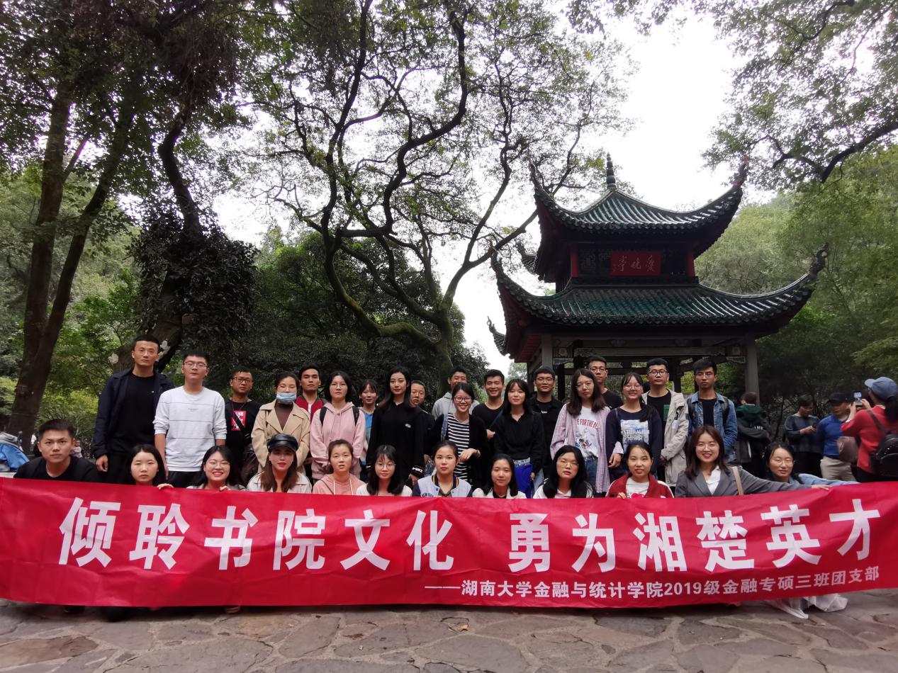 2019年10月13日,金融与统计线上真人百家乐 2019级金融专硕3班前往岳麓书院开展主题为“倾聆书院文化 勇为湖湘英才”的班级活动。本次活动由线上真人百家乐 指导,班级自主策划,在全院范围内组织开展,取得良好反响。