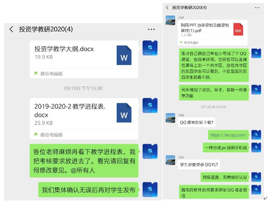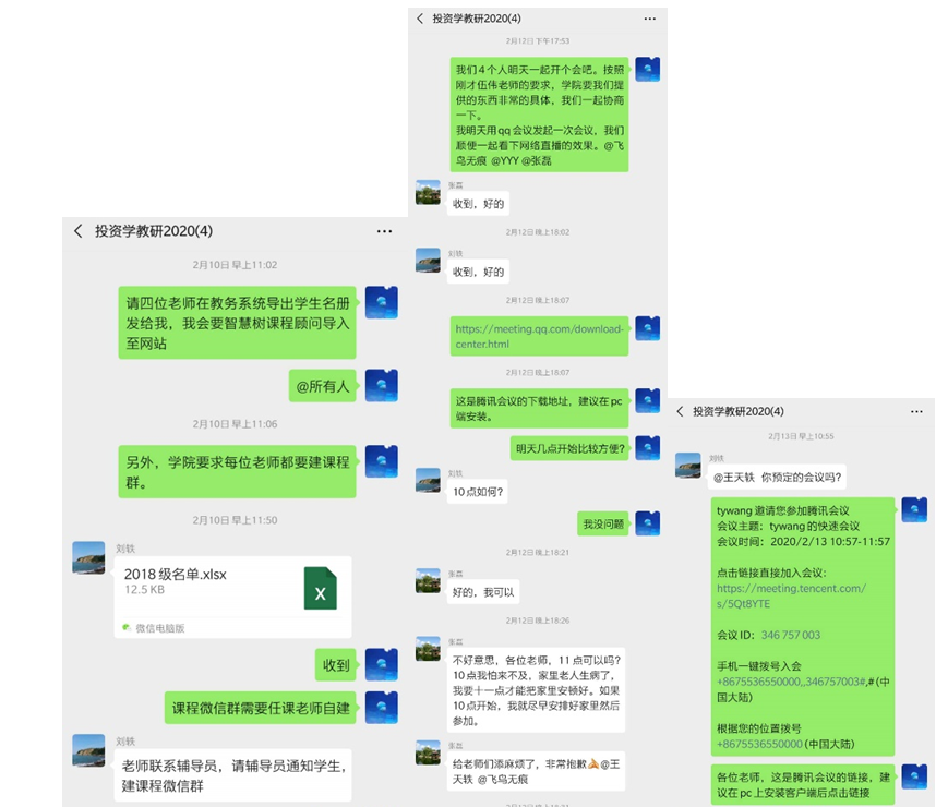 投资学教学团队在收到线上真人百家乐 关于新学期教学安排的通知后,第一时间通过微信群通知了团队成员建立课程微信群。王天轶老师于2月13日在教学团队内发起了腾讯会议,研讨新形势下的在线教学方案。当时,张磊老师恰逢家中老人生病,在需要兼顾家里老人、孩子的情况下克服重重困难,参加团队的在线会议,积极参与研讨,其兢兢业业、一心为学生的精神令所有人感动。
