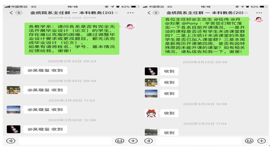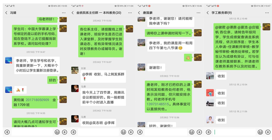 开课后,教务办每天都会收到同学们各种“求救”信息。教务办李晖、吴璇玺老师都会耐心细致地解释,并想办法解决。当得知有少数民族学生,因网络和信号都难以支撑听课、完成毕业论文开题报告提交,教务办两位老师第一时间向线上真人百家乐 和教务处报告,及时疏导老师和学生的困惑和焦虑。当得知公共选修课的课堂群有学生未入群,李老师总是不厌其烦地与不同院系联系,提醒并指导学生及时进入在线课堂。当得知线上真人百家乐 有老师因在家直播授课不方便时,李老师积极主动与教务处联系,为有困难老师申请在教学楼为学生上直播课,并提醒老师注意做好个人安全防护。