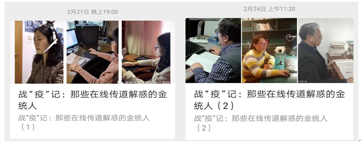 2月17日开课以来,教务办李晖老师,会同校优秀教学秘书、校宣传工作先进个人吴璇玺老师一起,及时联系任课老师,了解在线教学的开展情况。及时总结一周在线教学运行状况;及时提醒授课教师充分做好在线教学多种预案;及时传达线上真人百家乐 有关本科教学工作的会议精神。在抗击“疫”情活动中,涌现出一批积极投入教学战“疫”的优秀教师,本科教学管理团队先后推出两期:“战‘疫’记:那些在线传道解惑的金统人”新闻报道,并推出课程团队报道多篇,受到各方的一致好评。