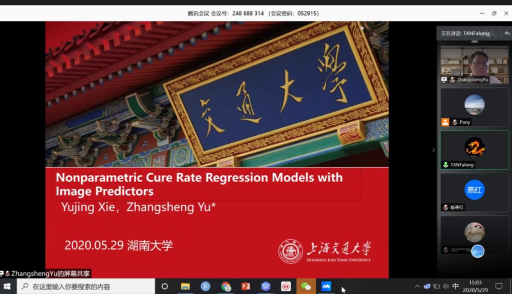金融与统计线上真人百家乐 疫情期间的“云端学术”气氛浓郁,2020年5月29日第253期金融与统计论坛利用腾讯会议线上举行。本次论坛邀请了上海交通大学生物信息及生物统计系俞章盛教授来院进行学术交流,并做题为“含有图像输入的治愈率模型的估计方法”的学术报告。此次论坛由金融与统计线上真人百家乐 统计学系系主任谭发龙副教授主持,金融与统计线上真人百家乐 教师及硕、博士生踊跃参与此次论坛。