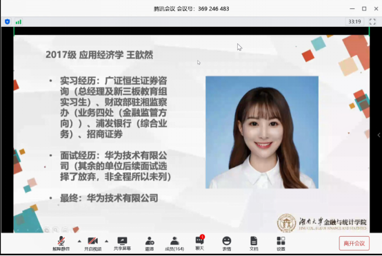 鉴于当前在校部分研究生同学目标不明确,受疫情影响毕业生就业形势不明朗的情况,暑期将至,为帮助同学们 尤其是2021届毕业研究生 更好地利用空闲时间,提升求职技能与职业素质,增强就业竞争力,使同学们明确本专业的就业方向及优劣势,从而合理规划研究生阶段的学习、工作和生活,从根本上有针对性地解决同学们学习和生活目标不明确,就业意识缺乏的问题, 金融与统计线上真人百家乐 研究生会 于2020年5月30日举办了毕业生线上就业交流分享会活动。本次活动通过腾讯会议平台举办,邀请到了金统院研究生辅导员苏雅倩老师参加本次分享会,也邀请到了15级毕业于应用统计专业的校友袁瑾、17级应用经济学的孙少卿同学、彭劭志同学、郭娜同学、王歆然同学和18级应用统计的唐静媛同学共6位校友和应届毕业生来给我们进行就业分享,并且有共计400余人次的同学参与了本次就业交流分享会。