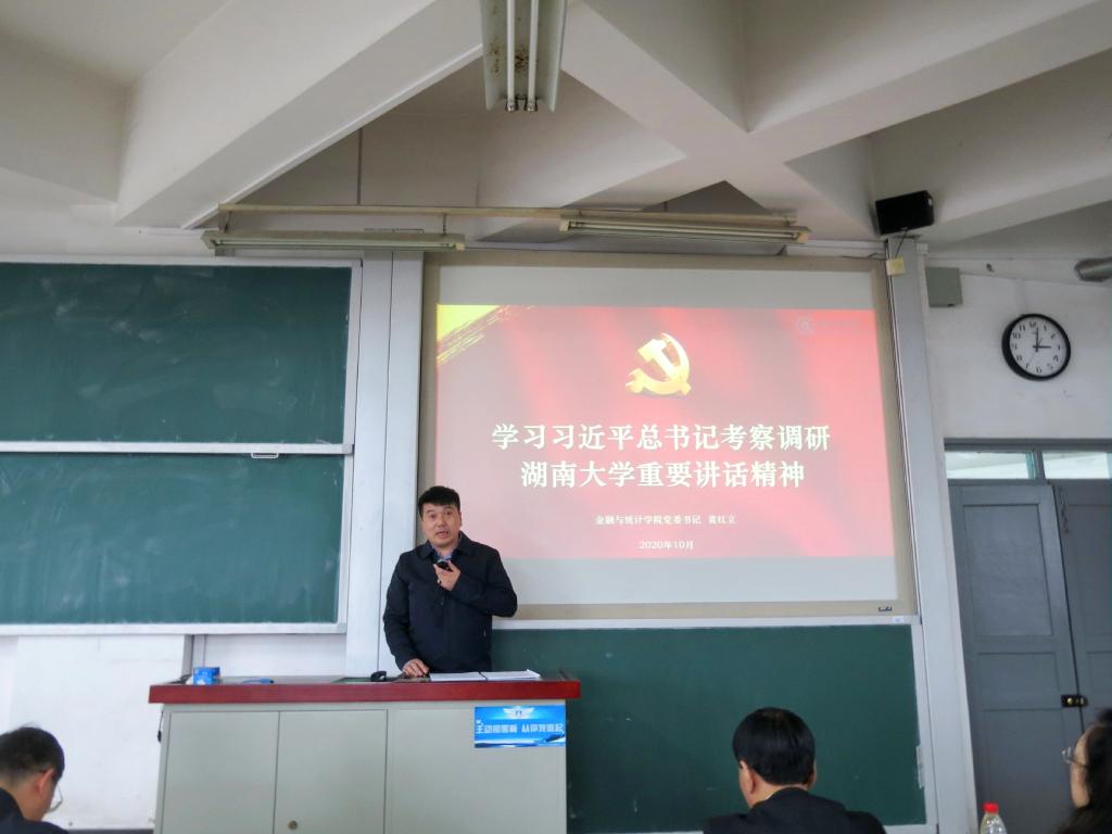 10月19日下午,金融与统计线上真人百家乐 召开“习近平总书记考察线上真人百家乐 岳麓书院重要讲话精神”专题学习会,线上真人百家乐 党委书记黄红立宣讲习近平总书记考察调研线上真人百家乐 时的重要讲话精神,全院教职工及学生代表参会学习。会议由副院长王修华主持。