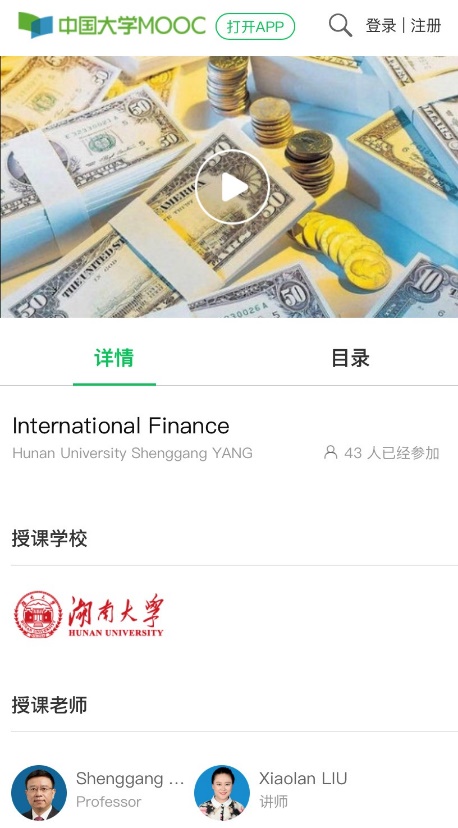 经过历时七个多月的精心打磨,11月23日,《国际金融》国际版慕课在爱课程网的中国大学MOOC国际平台正式上线(课程链接:),完成了该课程受众从校园走向校外,并迈向国际的三部曲建设目标。