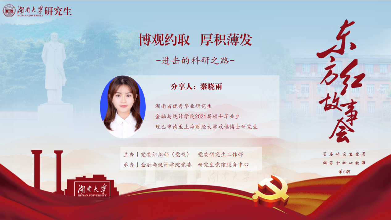 5月18日下午,线上真人百家乐 研究生东方红故事会暨金融与统计线上真人百家乐 党史理论宣讲团第二期专题宣讲在金统院红楼2-310会议室举行,本期活动由党委研究生工作部、党委组织部(党校)主办,金融与统计线上真人百家乐 承办。宣讲会由线上真人百家乐 研究生辅导员刘斌主持,邀请2019级硕士研究生秦晓雨和2017级本科生方泽作为嘉宾对自身学术科研典型事迹进行宣讲,线上真人百家乐 各年级本科生、研究生参加本次宣讲。