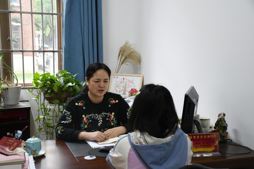 行政教辅党支部书记谢君与学生谈心交流。