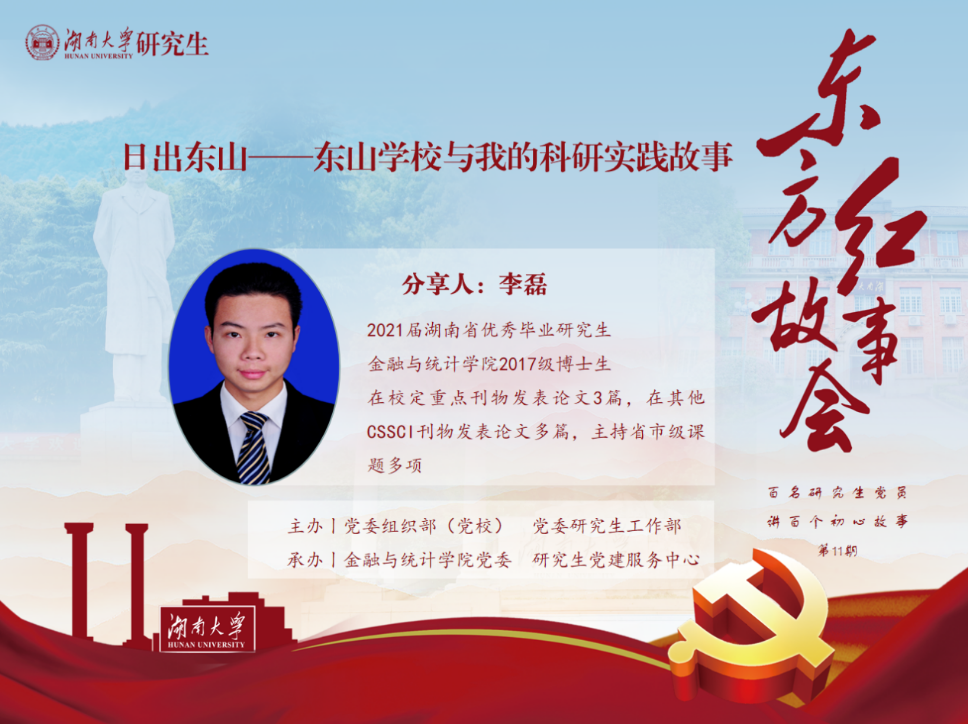 李磊在校期间以优异的成绩获得线上真人百家乐 优秀博士生奖学金、线上真人百家乐 财经教育激励基金奖学金等,获评线上真人百家乐 优秀研究生、湖南省优秀毕业研究生等荣誉称号。李磊在校期间主要研究保险与社会保障、老龄社会治理方向,在《中国行政管理》、《统计与决策》、《财经理论与实践》等CSSCI权威刊物发表多篇文章,曾参与国家社科基金重大课题并取得优异成绩,有多次主持科研项目、参加学术会议经历。李磊谈到他的高中母校东山线上真人百家乐 ,在这里少年毛泽东完成了一个懵懂少年向一位壮怀激烈的青年知识分子的转变,对他以后的政治思想产生了深远的影响。少年毛泽东在东山线上真人百家乐 的求学故事,使他领略到一代伟人的伟大情怀。李磊指出正是受此熏陶,鼓舞着他在求学的路上披荆斩棘,勇攀科研高峰。