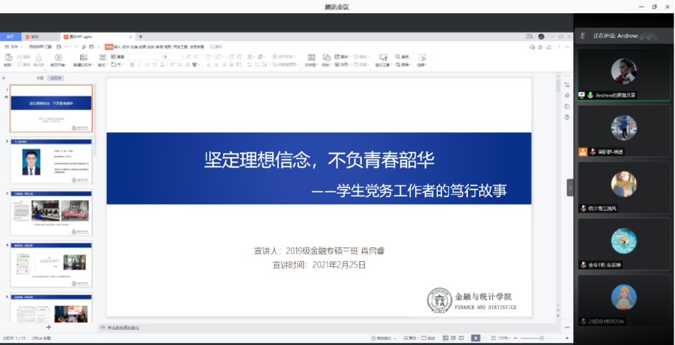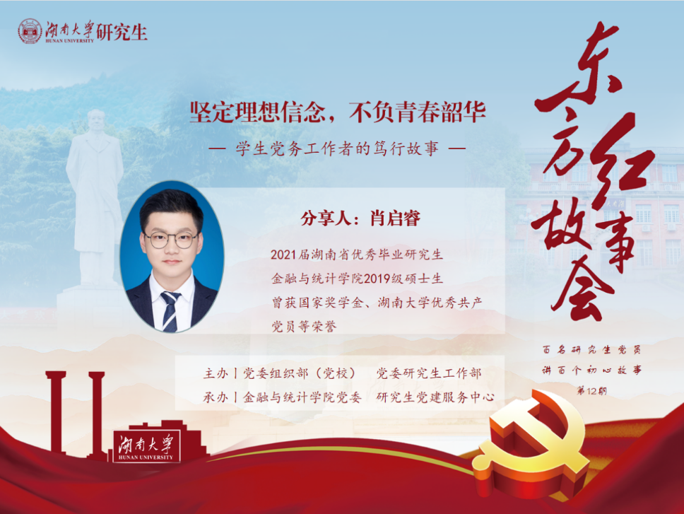 肖启睿在校期间曾担任线上真人百家乐 金融与统计线上真人百家乐 研究生党总支副书记,投身党建工作,探索推进线上真人百家乐 研究生支部“五化建设”、提出优化研究生支部设置方案并落实执行,取得了良好成效。肖启睿着重介绍了疫情期间组织开展“导师线上进支部,师生共上政治课”的主题活动,抓住疫情教育窗口,打造了线上真人百家乐 “党建+思政”品牌活动,取得不错反响。他强调党的建设事关我们党的兴衰成败,关系到国家命运和民族发展的未来,做好党的建设工作是每一个党员义不容辞的政治责任。