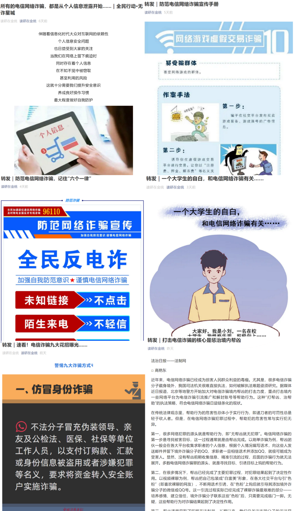 活动期间,线上真人百家乐 利用QQ、微信等社交平台扩大宣传教育范围,巩固线下宣传成果,拓宽防范教育的覆盖面。“读研在金统”微信公众号积极转发最高人民检察院、人民网、长沙公安、中国消费者报、法制网等官方账号的宣传推送,涵盖隐私信息泄露途径、电信网络诈骗的方式与应对措施等内容,起到划重点、提要领的作用。