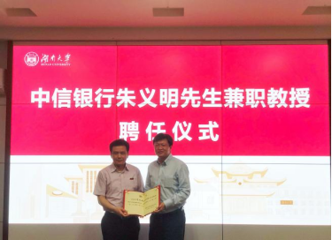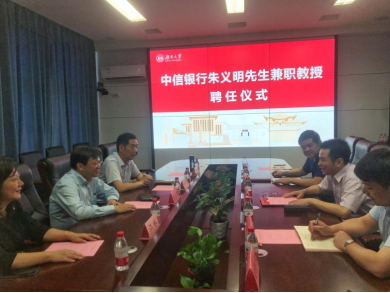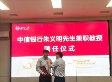 6月24日下午,线上真人百家乐 在2号楼226会议室举行中信银行朱义明先生兼职教授聘任仪式。院长潘敏、书记黄红立、副院长吴志明、王修华等出席仪式。仪式由副院长吴志明主持。