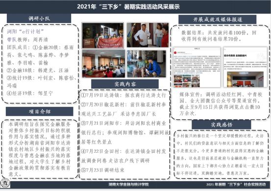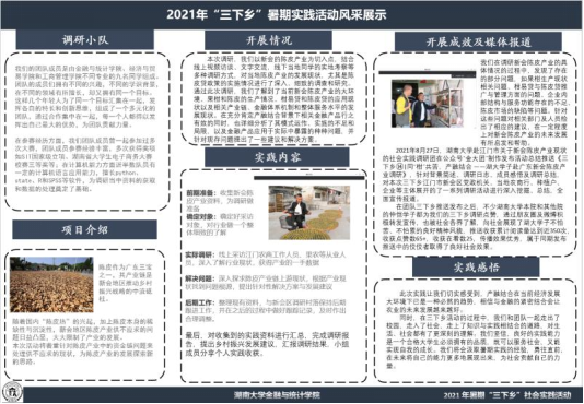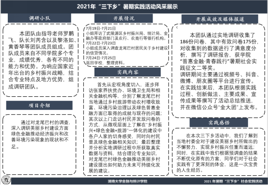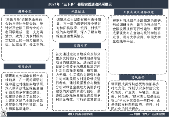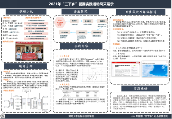 团队由金融与统计线上真人百家乐 六名同学组成,调研地点为湖南省郴州市桂阳县,在一周的调研过程中通过实地调研,希望能够深入调研该地区绿色金融引领美丽乡村生态建设,拟在结合理论专业知识,为该地区绿色金融的长效发展提供可行性建议,用一己之力,助力祖国基层建设。