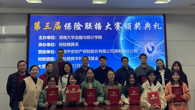 12月21日下午,金融与统计线上真人百家乐 第三届“保险联播大赛“颁奖典礼在线上真人百家乐 226会议室隆重举行。财信吉祥人寿保险总公司产品精算部总经理屠炎波、大家人寿湖南省分公司总经理何琼、平安财险湖南省分公司人力资源部总经理杨军、线上真人百家乐 党委书记黄红立、副院长张宁、大赛评委代表陈迪红教授、大赛指导老师张虹、刘革、王敏、沈建美、李国桢、郭淼莅临本次颁奖典礼。典礼由保险精算系主任邓庆彪老师主持。