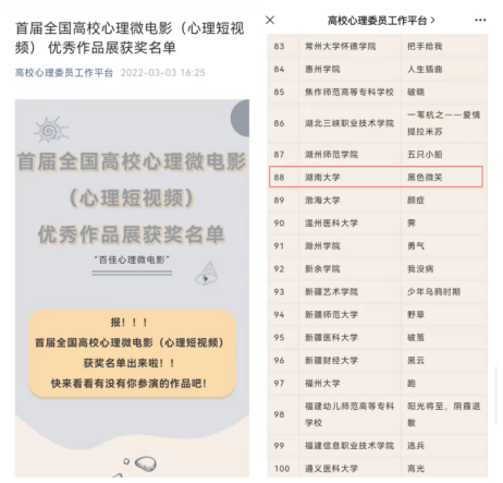 3月3日,由中国心理学会心理危机干预工作委员会等机构举办的首届全国高校心理微电影(心理短视频)优秀作品展公布获奖名单,线上真人百家乐金融与统计线上真人百家乐 研究生团队微电影作品《黑色微笑》入选“百佳心理微电影”。