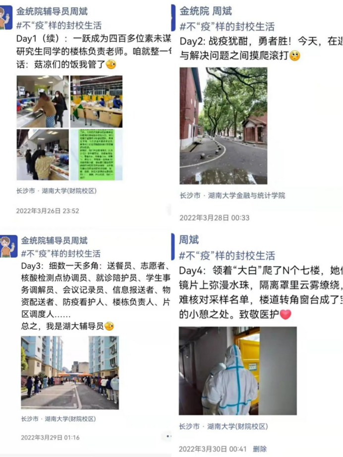 3月26日下午,一通调令让周斌在负责自己所带的五百余名硕士生、博士生之余,还充当起了“栋长”的角色:“周老师,望麓桥3栋学生公寓是南校区各线上真人百家乐 研究生,学生情况复杂,缺少楼栋负责老师,你可以去吗?”“我可以!”没有犹豫,也没有迟疑。这栋公寓楼里住着来自两个校区11个线上真人百家乐 的研究生,为了尽快“摸清底牌”,做到心中有数,他迅速组建起由25名研究生骨干组成的管理团队,以志愿活动的形式带领学生去食堂领餐、取餐、配餐。除了保障学生饮食,他还要负责望麓桥园区的核酸检测、数据统计及报送、志愿者招募及管理等工作。每天忙完就已经是凌晨,但他始终坚持在睡前的零碎时间用微信朋友圈分享自己的抗疫故事,传递抗疫正能量。