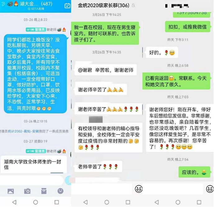 谢君接到疫情消息后,第一时间摸排学生信息,全盘摸清“自己的学生到底在哪里,是否安全”。她通过下寝室、打电话、聊微信等方式,关心着自己的“孩子们”,并为他们进行心理疏导等,确保孩子们每天“吃得好、睡得好、学得好”。为了不让家长们担心,她还每天在家长群里发布线上真人百家乐 最新的“抗疫动态”,并向家长们承诺:“我一直在,你们不用紧张,孩子们我会尽全力替大家照顾。”有了这句承诺,家长们对线上真人百家乐 充满了信心,“我们家长们不要恐慌,老师会照顾好我们的孩子的”“都不要担心,线上真人百家乐 肯定会尽快解决的”……